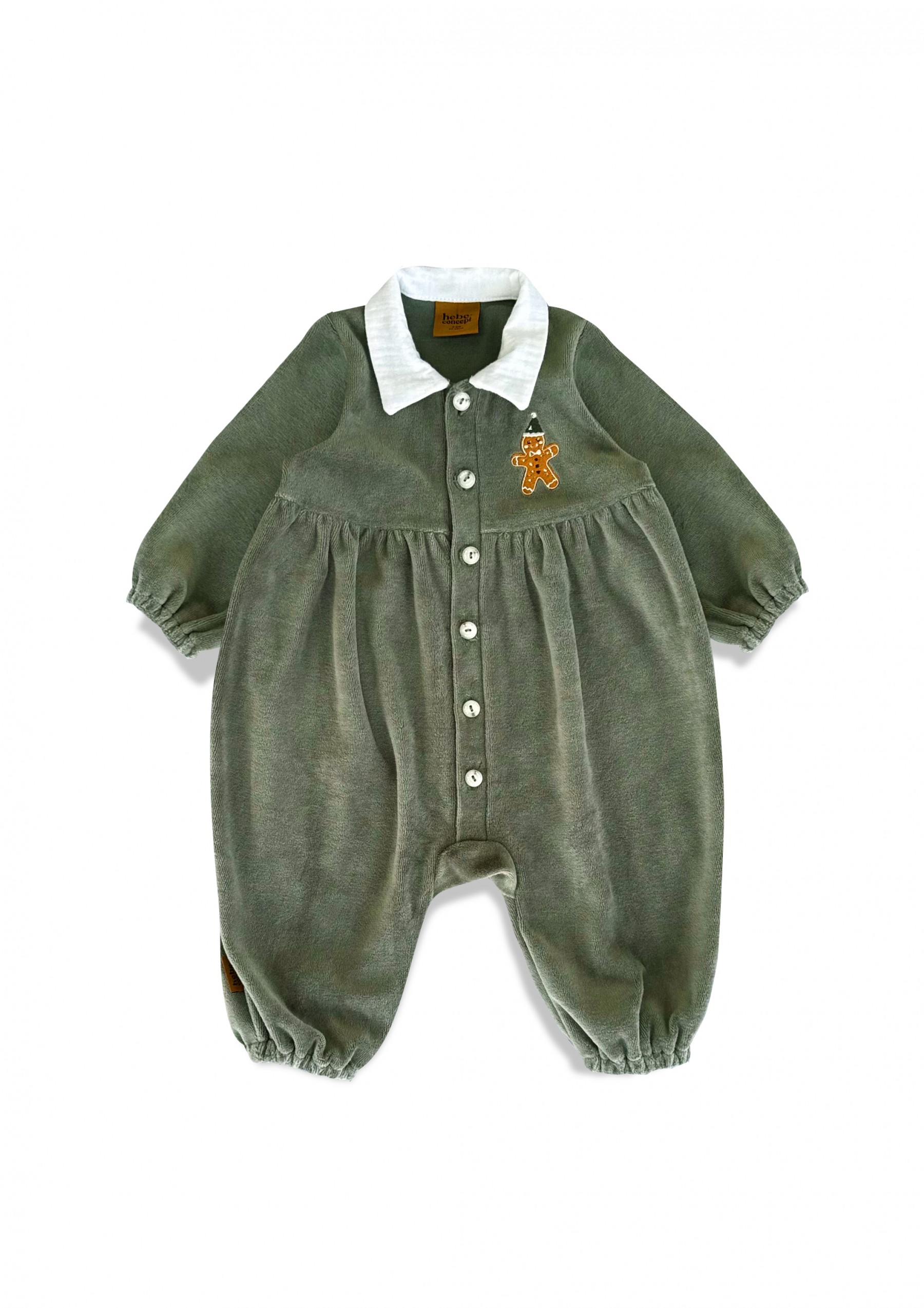 Velvet romper with Gingerman embroidery, collar and buttons green