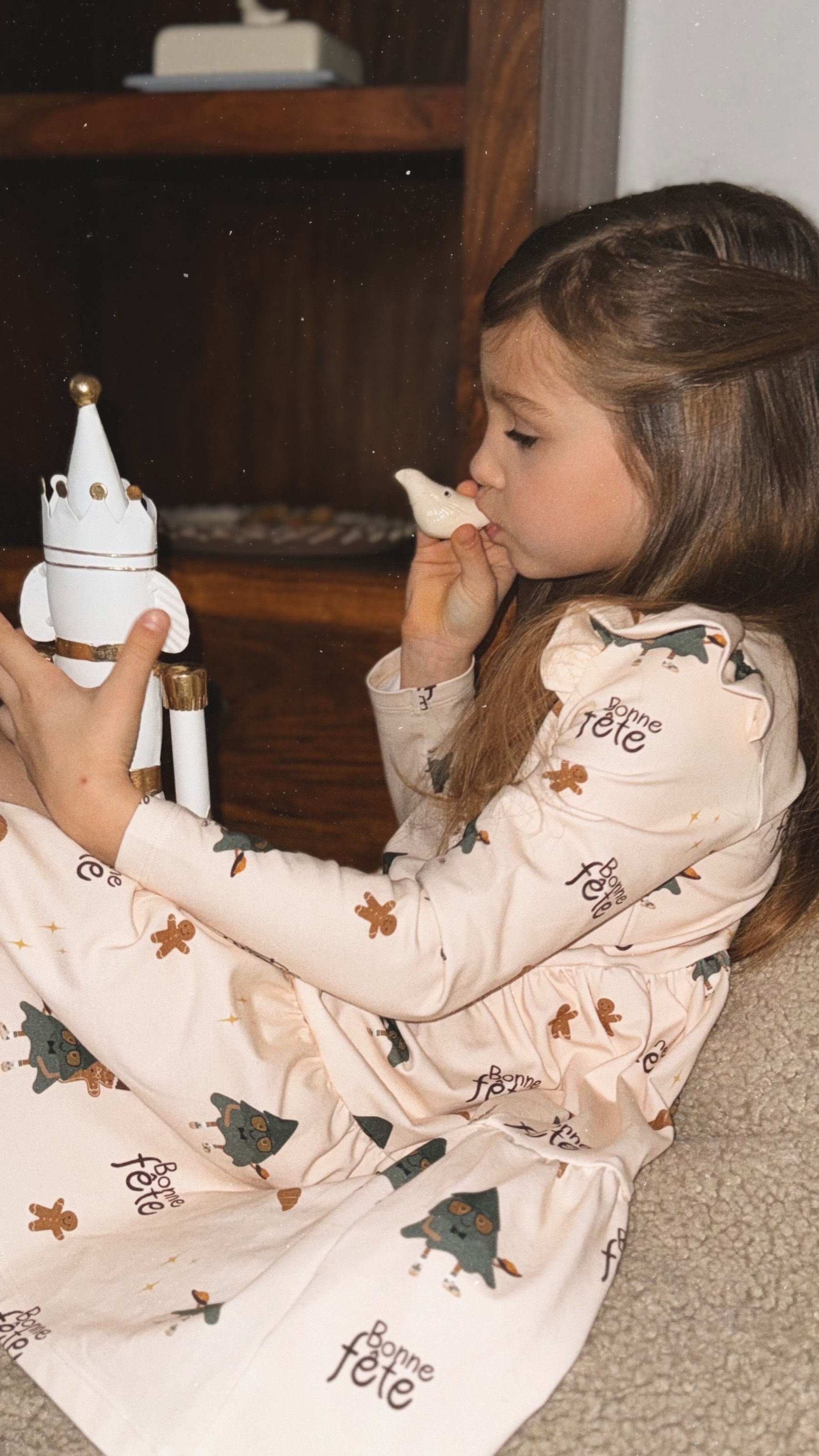 Kleita ar svētku apdruku un spiedpogu pie apkakles