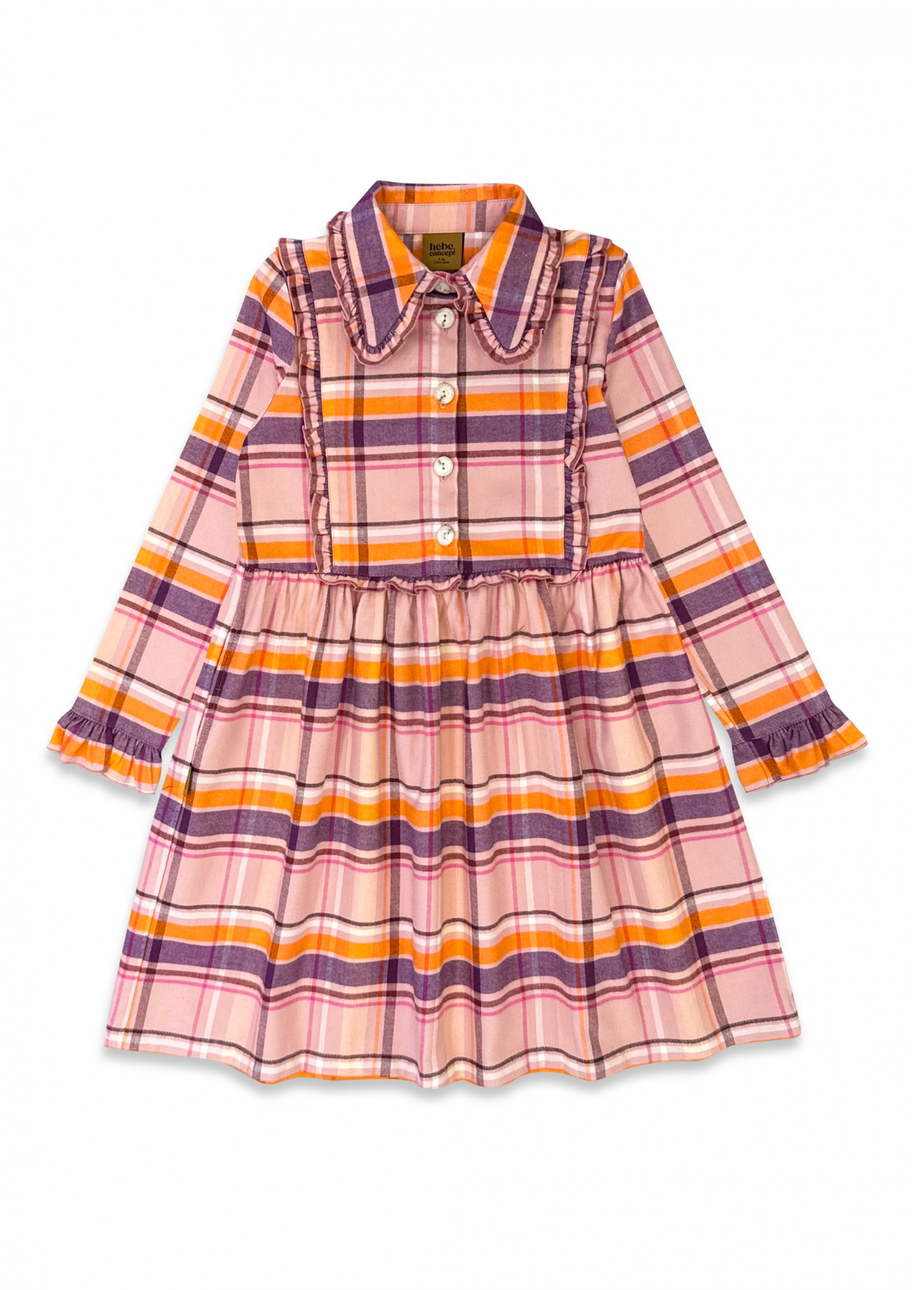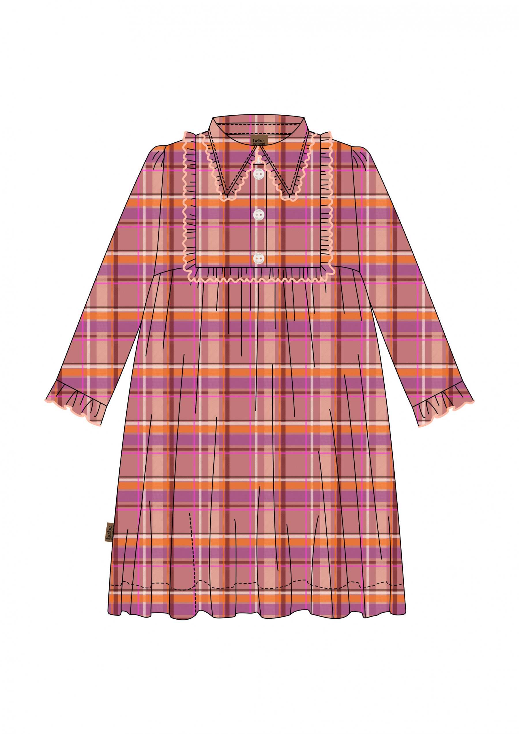 Kleita persiku/rozā rūtaina flaneļa ar apkakli un rišu